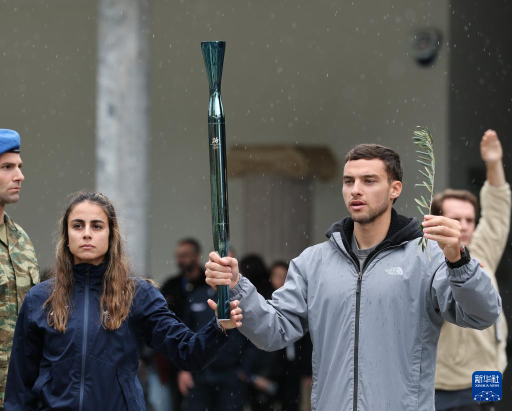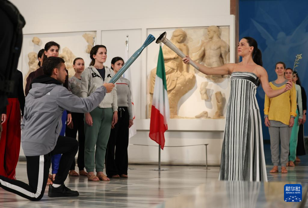 11月25日,第一棒火炬手、希腊运动员彼得罗斯(右)在彩排中。新华社记者 吕优 摄