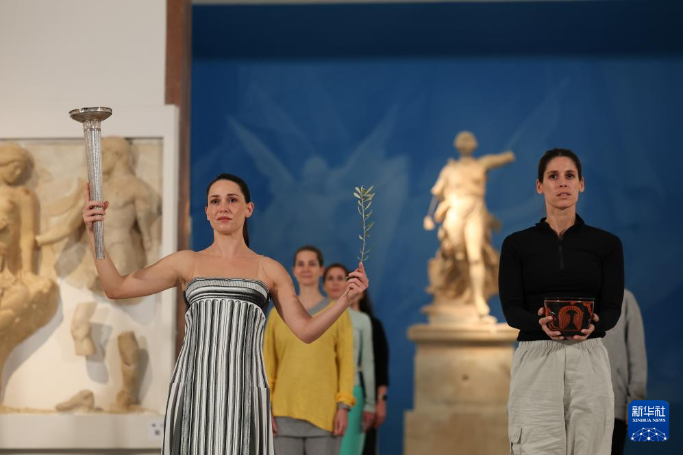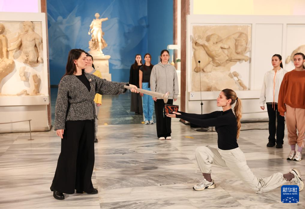 11月25日,扮演最高女祭司的演员玛丽·米娜(右)与第一棒火炬手、希腊运动员彼得罗斯在彩排中。新华社记者 李京 摄